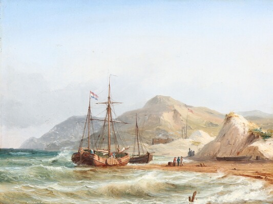 Seascape with ships at a rocky coast