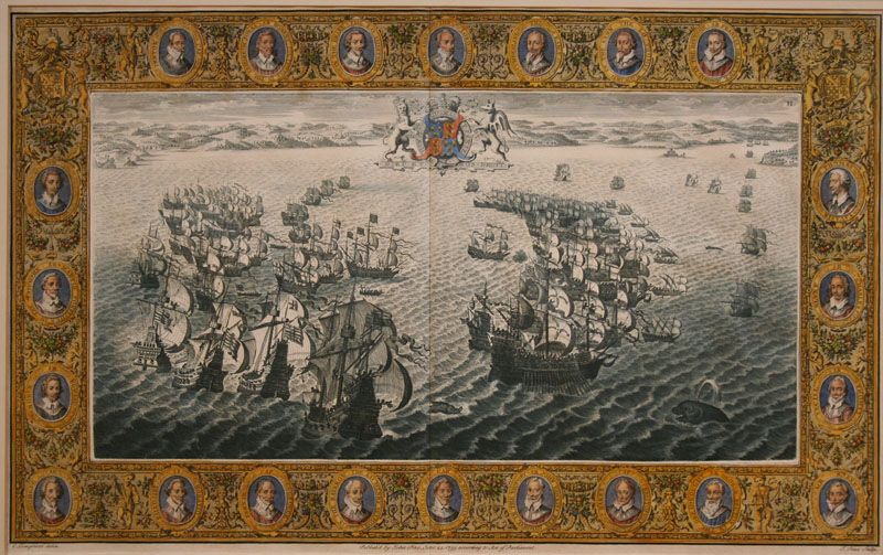 Plate II from the Spanish Armada Battle Views, within a Twenty-two Portrait Vignette Border