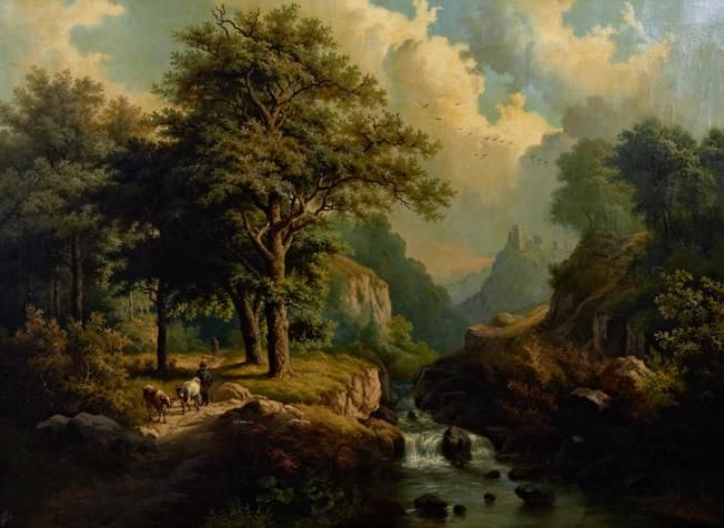 A herdsman on a track by a stream, a castle beyond