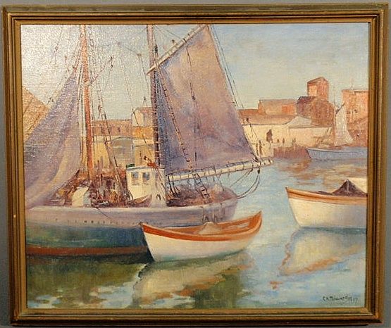 Painting of boats in a village harbor