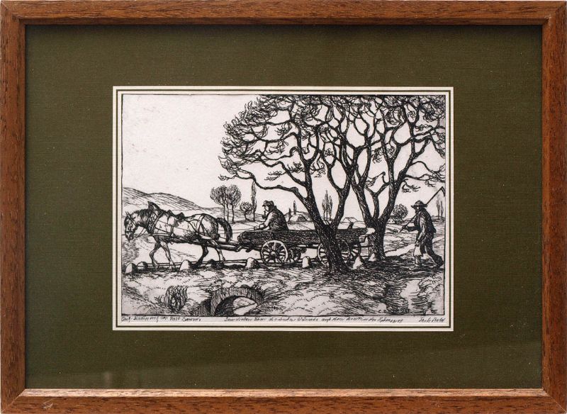 Bauern mit Pferdegespann in weiter Frühlingslandschaft