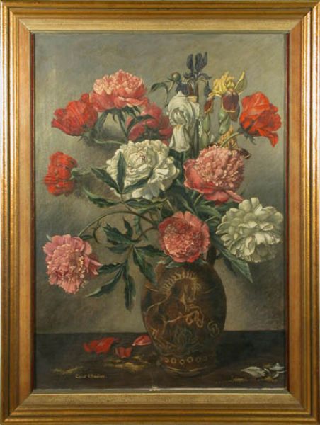 Prächtiger Pfingstrosenstrauß mit Schwertlilien in brauner Tonvase