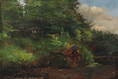 “Ved en Skovsø efter en Mild Regn”. Signed an dated C. F. Aagaard the 18th of june 1890. Oil on canvas. 35.5×50 cm. | |