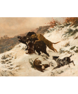 Winterlandschaft mit Jagdhunden und Wildschwein