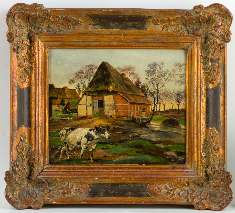 Nach dem Regen. Reetgedecktes Fachwerkbauernhaus und Kuh