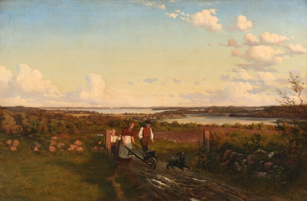 | View of a broad landscape with a farming family, in the distance a fiord | |