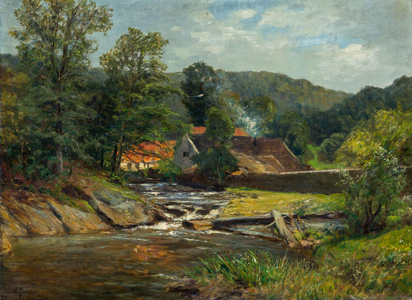 Flusstal im Teutoburger Wald. Enges bewaldetes Tal und Gehöft
