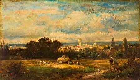 Das Werk ist zwischen 1860 und 1870 einzuordnen. Blick von der Höhe in weite Landschaft mit Landleuten bei der Heuernte. Im Hintergrund Stadtansicht mit zahlreichen Türmen. Im Vordergrund rechts kleiner Bildstock | |