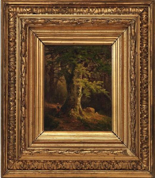 Waldlandschaft mit grosser Eiche und Bauersfrau