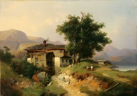Alpenlandschaft mit Gehöft und Figurenstaffage.