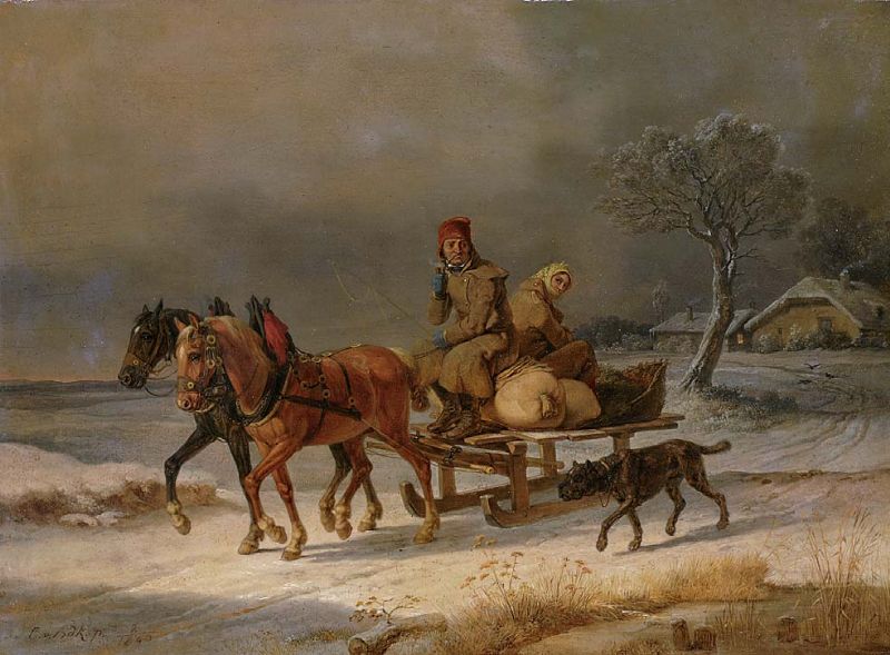 | Winterliche Schlittenfahrt mit Bauer und Bäuerin, daneben ein Hund herlaufend | |