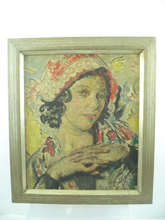 | A head and shoulders portrait of a woman wearing a colourful bonnet | |