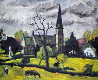 | Landscape with a church with spire and cattle to foreground | |