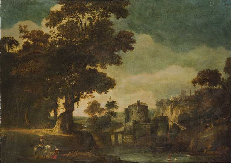 | Paesaggio fluviale con borgo turrito e cavaliere che incontra una zingara in primo piano | |