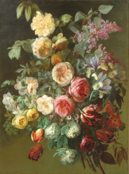 Spray of roses, tulips, lilac, hydrangea and dog roses