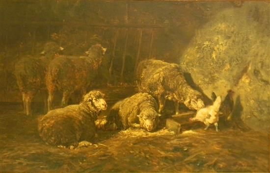 barn interior with sheep and chickens