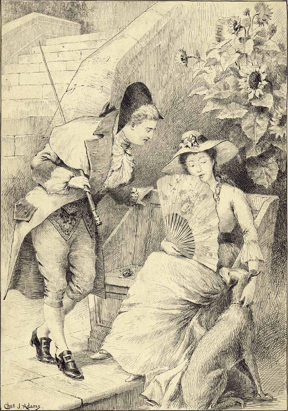 Historisierende Szene mit einem Mann u. einer Frau mit Fächer u. Hund