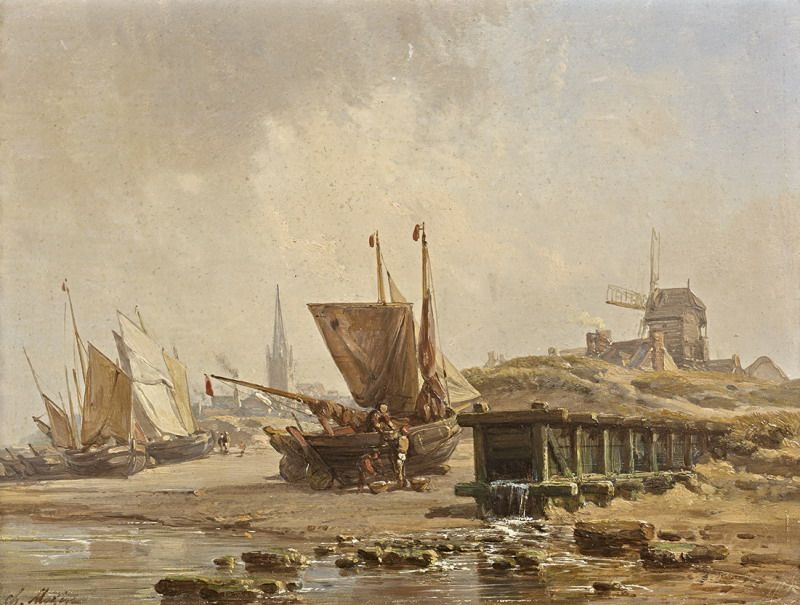 | BARQUES DE PECHE SUR UNE GREVE, UN MOULIN ET UN CLOCHER DANS LE FOND. | |
