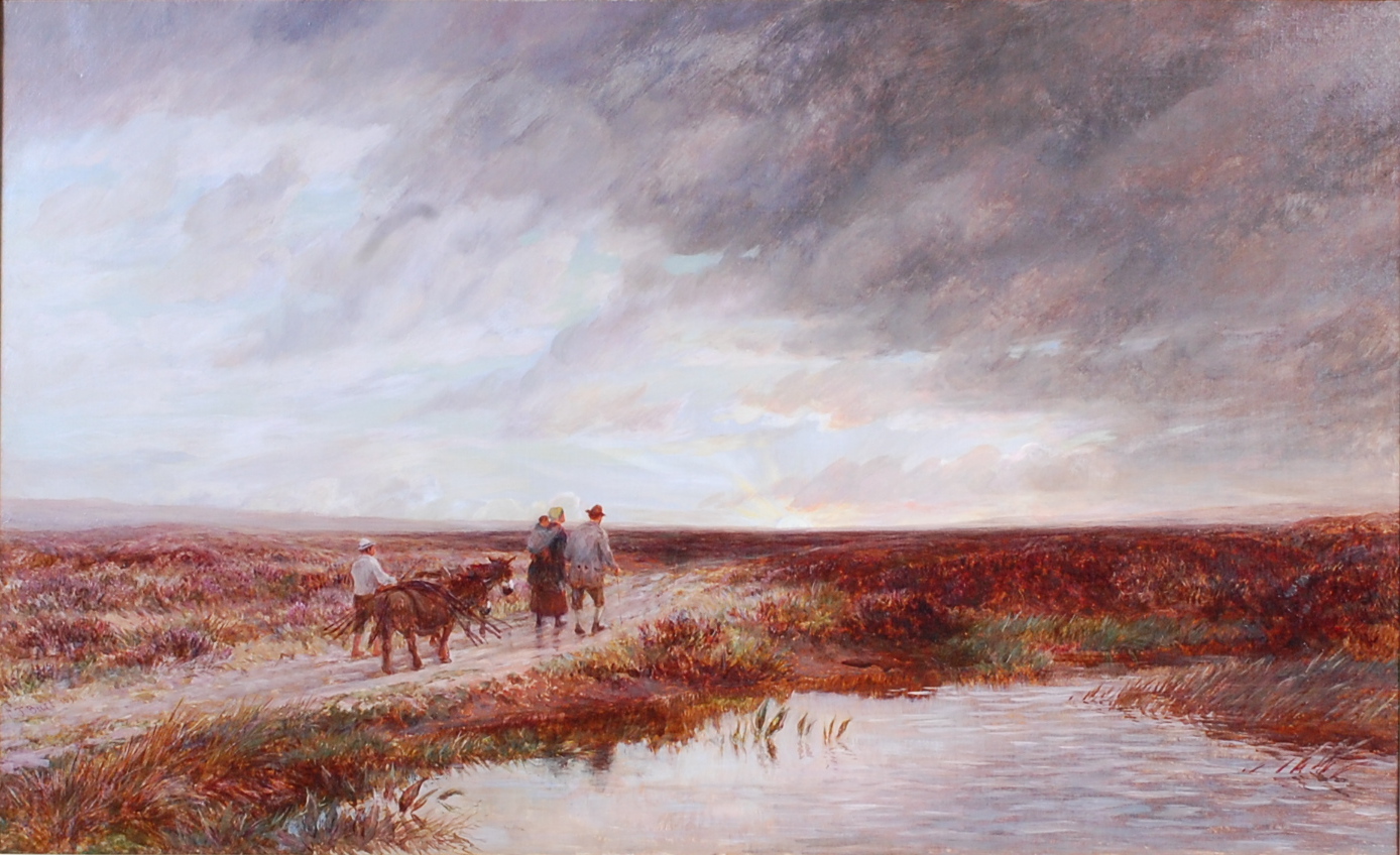 | A travelling family with donkeys along a moorland track at sunset, with distant village beyond | |