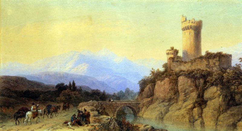 | landscape scene with travellers riding towards river bridge and castle tower before mountains beyond | |