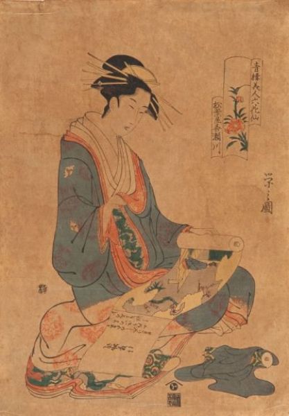 | Matsubaya oglądająca ilustracje zwoju "Ise monogatari", pocz. XX wieku | |