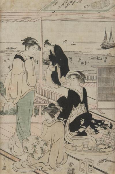 | Oban tate-e, part of triptych, four courtesans on the terrace of a tea house overlooking a beach. | |
