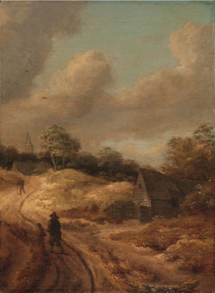Gewitterlandschaft mit kleinem Weg und Figurenstaffage – im Hintergrund ein Dorf