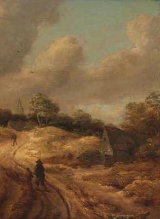 | Gewitterlandschaft mit kleinem Weg und Figurenstaffage – im Hintergrund ein Dorf | |