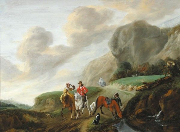 | Bergachtig landschap met enkele figuren te paard, bezig met een valkenjacht | |
