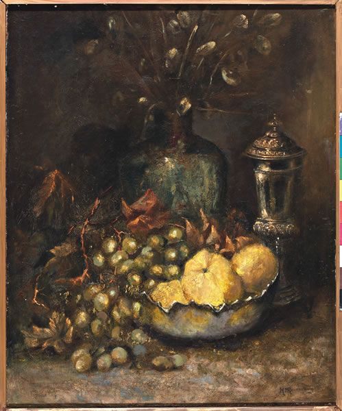 Stilleven met druiven en zilveren bokaal