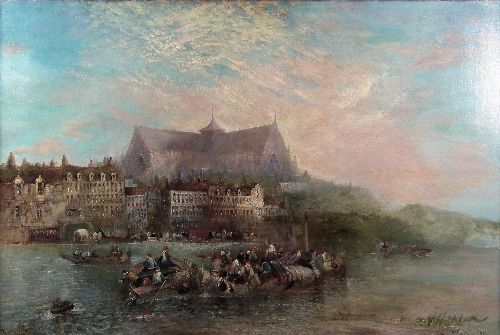| A French Town, French river scene with figures on boat to foreground, and town and Cathedral to background | |