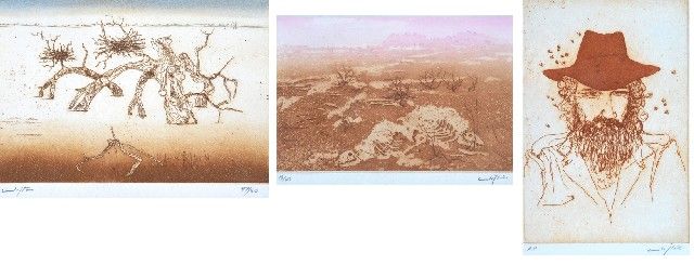 Three etchings i) Portrait ii) Desert Landscape iii) Drought Carcass