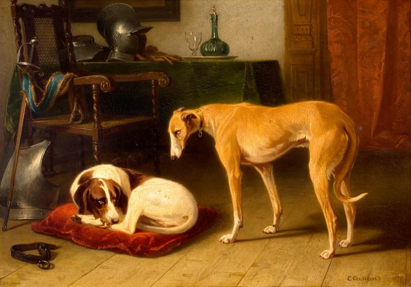 Twee treurende honden bij het harnas van hun overleden meester