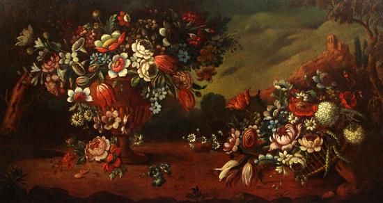 An urn of flowers alongside a basket of flowers, a landscape beyond