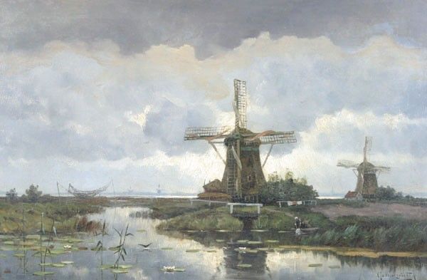 polderlandschap met watermolens.