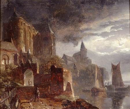 VUE NOCTURNE D'UNE VILLE FORTIFIEE PRES D'UNE RIVIERE