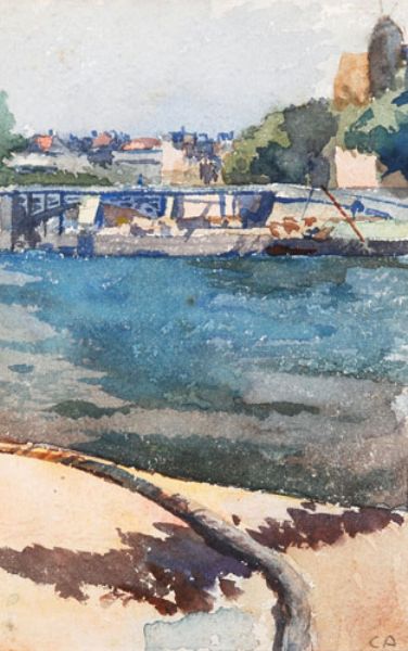 Uferlandschaft, im Hintergrund eine Stahlbrücke, am Horizont Stadthäuser