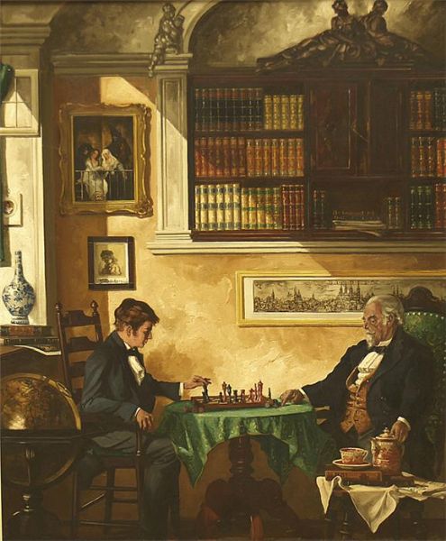 Herren bei einer Partie Schach im Arbeitszimmer.