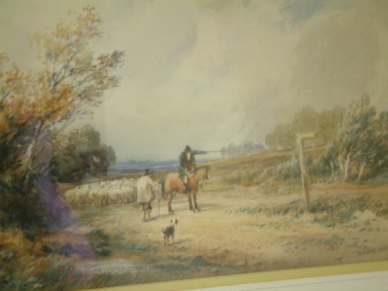 Figures in a rural landscape with a man on horseback showing directions to a shepherd