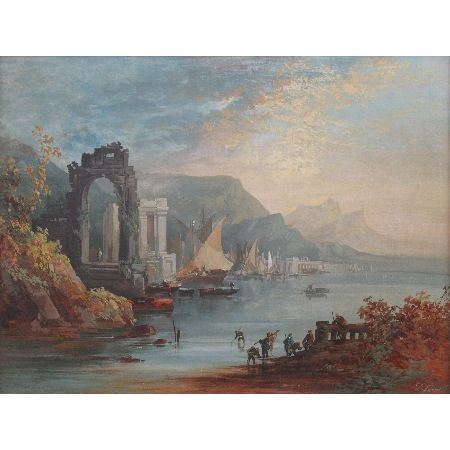 busy continental lake landscape with ruined buildings numerous boats and figures