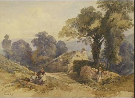 rural landscape with figures in a lane outside a cottage
