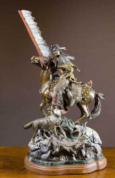 "The Defender," Native American warrior on horseback and wolf
