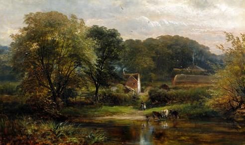 Figure and cattle by a river by a farm and hamlet in a river valley