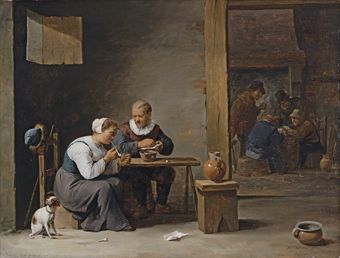 | A man and woman smoking a pipe, seated in an interior, with peasants playing cards beyond | |
