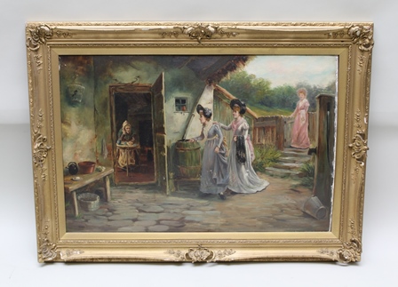 | Fortune Teller, three young society ladies visiting an old lady in her cottage | |