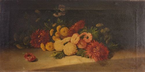 A Pair, Still Life Chrysanthemums and Carnations on a Ledge and Peaches nad Grapes on a Ledge