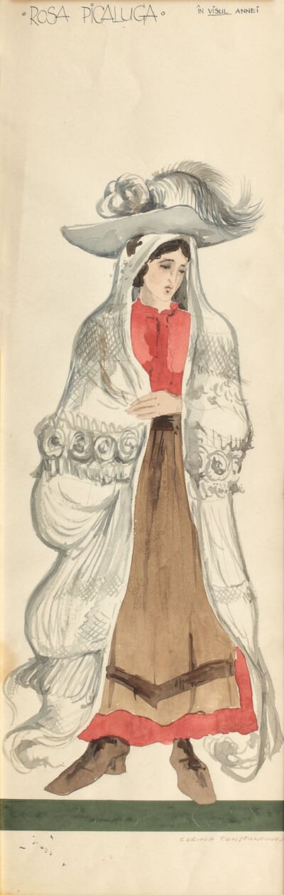 Schiţă de costum pentru personajul Rosa, spectacolul "Emigrantul din Brisbane" de Georges Schehade, decor Liviu Ciululei, regia