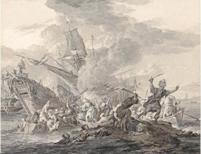 La prise d'un vaisseau turc pendant la bataille de Lépante Plume et lavis gris