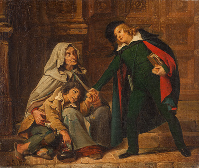 Scholar, giving a hand to a beggar and her son