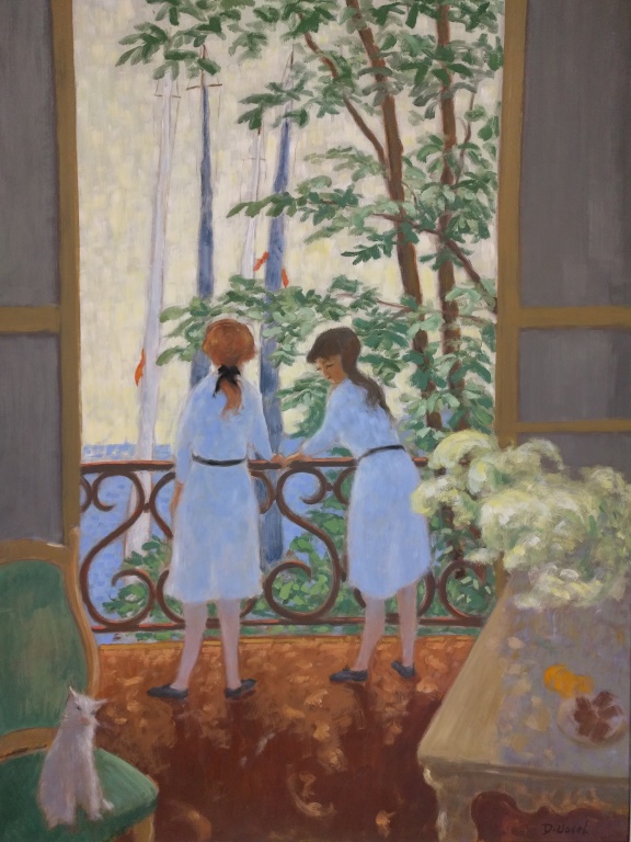 girls on a balcony with a cat